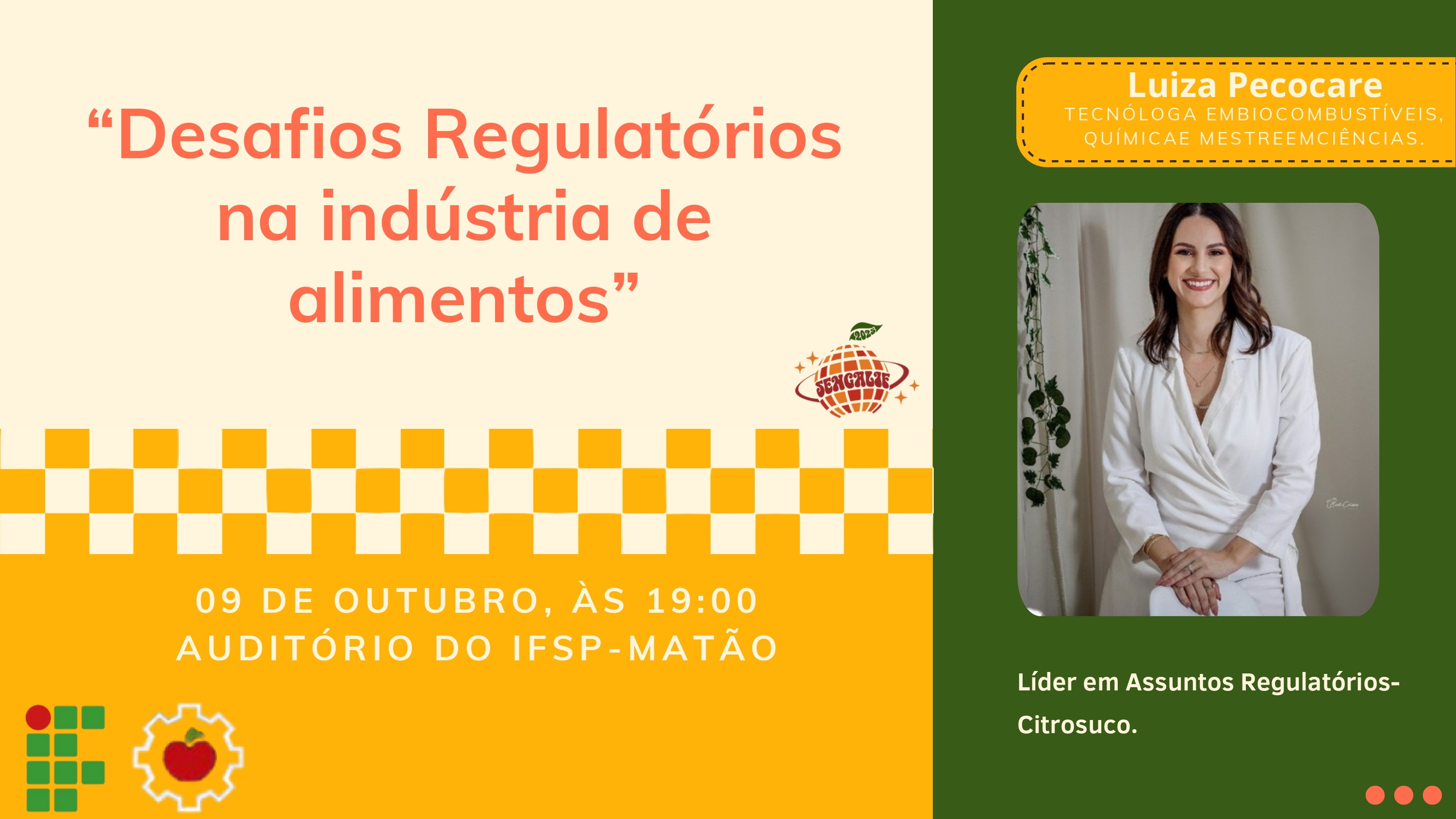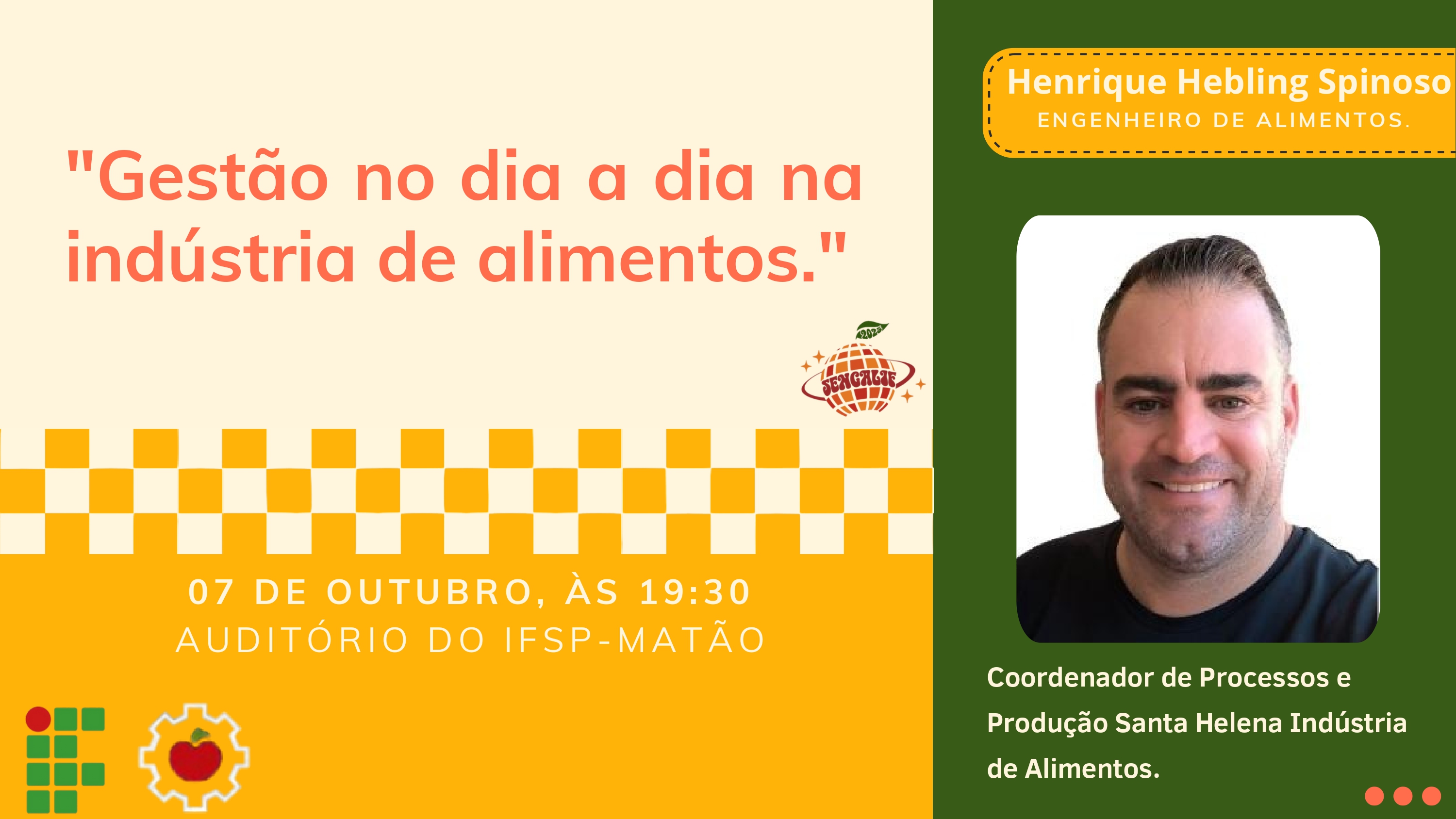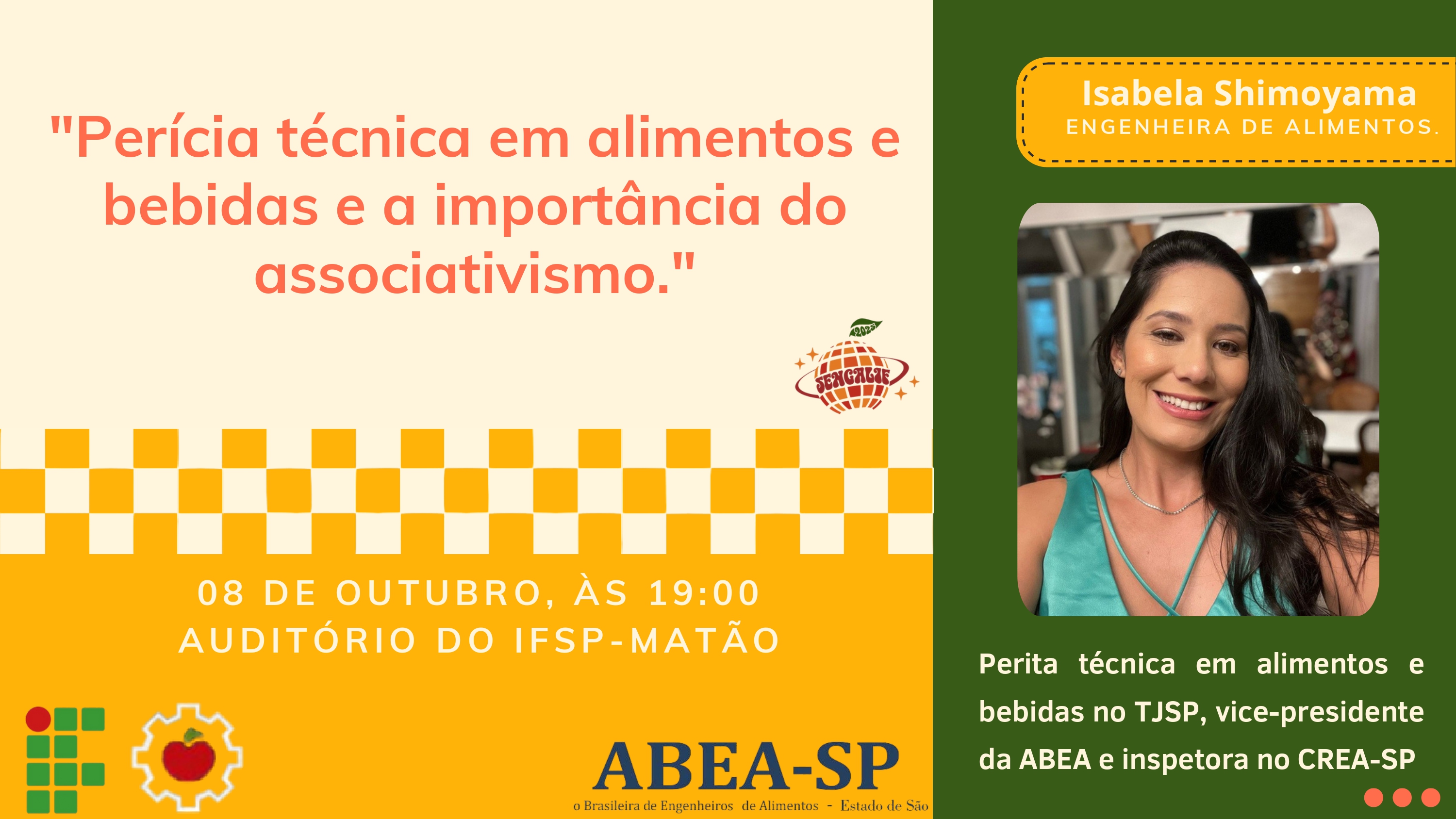 O Instituto Federal de Educação, Ciência e Tecnologia de São Paulo (IFSP – Câmpus Matão), em parceria com a Comissão Organizadora e o Centro Acadêmico de Engenharia de Alimentos – C.A.M.R. (Centro Acadêmico Márcia Rizzatto), promoverá a VIII SENGALIF – Semana de Engenharia de Alimentos, que acontecerá de 07 a 09 de outubro de 2025.